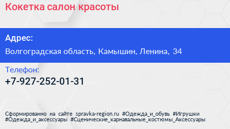 Кокетка, салон красоты по адресу Волгоградская область, Камышин, Ленина, 34 в дальнейшем Организация, размещена в следующих категориях: