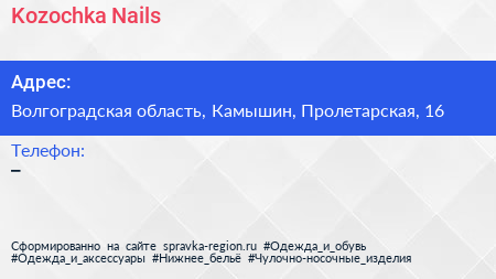 Kozochka Nails по адресу Волгоградская область, Камышин, Пролетарская, 16 в дальнейшем Организация, размещена в следующих категориях: