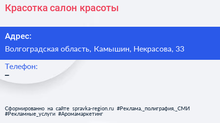 Красотка, салон красоты по адресу Волгоградская область, Камышин, Некрасова, 33 в дальнейшем Организация, размещена в следующих категориях: