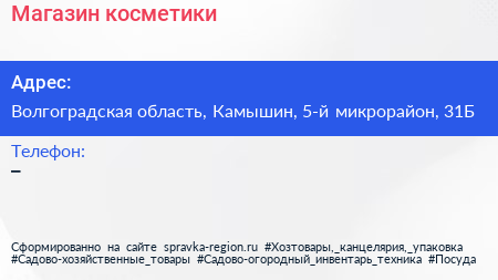 Магазин косметики по адресу Волгоградская область, Камышин, 5-й микрорайон, 31Б в дальнейшем Организация, размещена в следующих категориях: