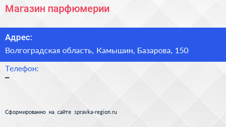 Магазин парфюмерии по адресу Волгоградская область, Камышин, Базарова, 150 в дальнейшем Организация, размещена в следующих категориях: