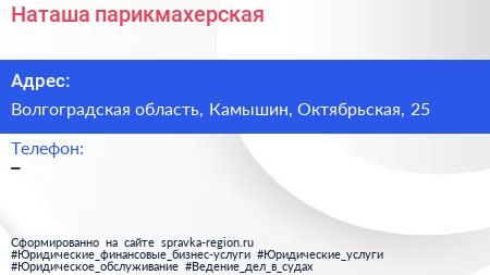 Наташа, парикмахерская по адресу Волгоградская область, Камышин, Октябрьская, 25 в дальнейшем Организация, размещена в следующих категориях: