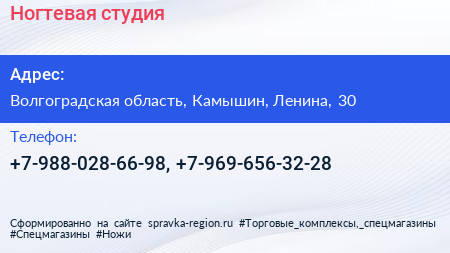 Ногтевая студия по адресу Волгоградская область, Камышин, Ленина, 30 в дальнейшем Организация, размещена в следующих категориях:
