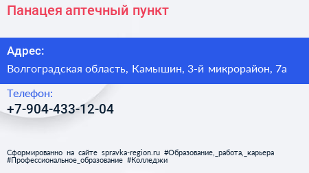 Панацея, аптечный пункт по адресу Волгоградская область, Камышин, 3-й микрорайон, 7а в дальнейшем Организация, размещена в следующих категориях: