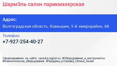 ШармЭль, салон-парикмахерская по адресу Волгоградская область, Камышин, 5-й микрорайон, 68 в дальнейшем Организация, размещена в следующих категориях: