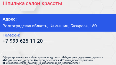 Шпилька, салон красоты по адресу Волгоградская область, Камышин, Базарова, 160 в дальнейшем Организация, размещена в следующих категориях: