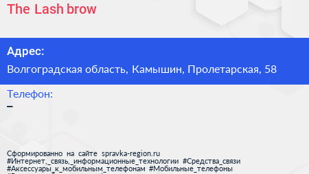 The Lash & brow по адресу Волгоградская область, Камышин, Пролетарская, 58 в дальнейшем Организация, размещена в следующих категориях:
