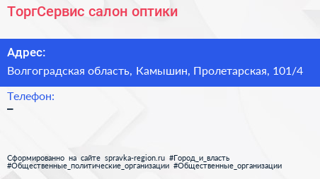 ТоргСервис, салон оптики по адресу Волгоградская область, Камышин, Пролетарская, 101/4 в дальнейшем Организация, размещена в следующих категориях: