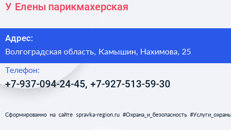 У Елены, парикмахерская по адресу Волгоградская область, Камышин, Нахимова, 25 в дальнейшем Организация, размещена в следующих категориях: