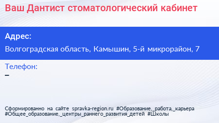Ваш Дантист, стоматологический кабинет по адресу Волгоградская область, Камышин, 5-й микрорайон, 7 в дальнейшем Организация, размещена в следующих категориях: