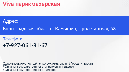 Viva, парикмахерская по адресу Волгоградская область, Камышин, Пролетарская, 58 в дальнейшем Организация, размещена в следующих категориях: