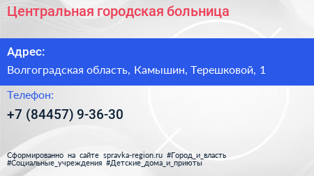 Центральная городская больница по адресу Волгоградская область, Камышин, Терешковой, 1 в дальнейшем Организация, размещена в следующих категориях:
