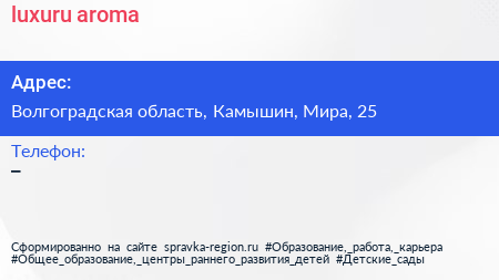 luxuru-aroma по адресу Волгоградская область, Камышин, Мира, 25 в дальнейшем Организация, размещена в следующих категориях: