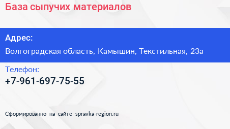 База сыпучих материалов по адресу Волгоградская область, Камышин, Текстильная, 23а в дальнейшем Организация, размещена в следующих категориях: