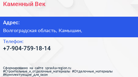 Каменный Век по адресу Волгоградская область, Камышин, в дальнейшем Организация, размещена в следующих категориях: