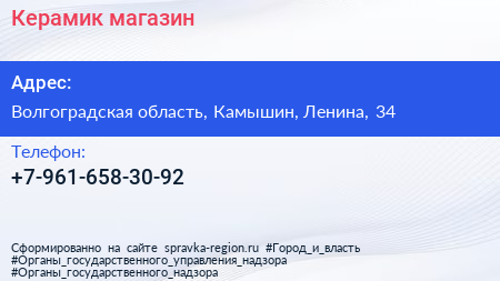 Керамик, магазин по адресу Волгоградская область, Камышин, Ленина, 34 в дальнейшем Организация, размещена в следующих категориях: