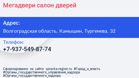 Мегадвери, салон дверей по адресу Волгоградская область, Камышин, Тургенева, 32 в дальнейшем Организация, размещена в следующих категориях: