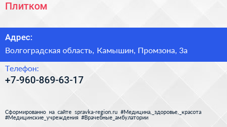 Плитком по адресу Волгоградская область, Камышин, Промзона, 3а в дальнейшем Организация, размещена в следующих категориях: