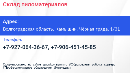 Склад пиломатериалов по адресу Волгоградская область, Камышин, Чёрная гряда, 1/31 в дальнейшем Организация, размещена в следующих категориях:
