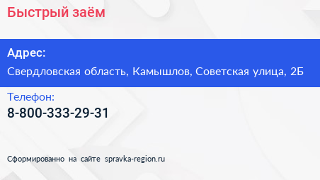 Быстрый заём по адресу Свердловская область, Камышлов, Советская улица, 2Б в дальнейшем Организация, размещена в следующих категориях: