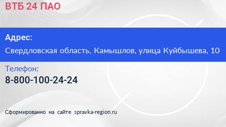 ВТБ 24, ПАО по адресу Свердловская область, Камышлов, улица Куйбышева, 10 в дальнейшем Организация, размещена в следующих категориях: