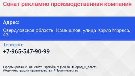 Сонат, рекламно-производственная компания по адресу Свердловская область, Камышлов, улица Карла Маркса, 43 в дальнейшем Организация, размещена в следующих категориях: