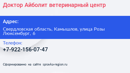 Доктор Айболит, ветеринарный центр по адресу Свердловская область, Камышлов, улица Розы Люксембург, 6 в дальнейшем Организация, размещена в следующих категориях: