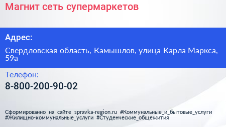 Магнит, сеть супермаркетов по адресу Свердловская область, Камышлов, улица Карла Маркса, 59а в дальнейшем Организация, размещена в следующих категориях: