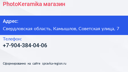 PhotoKeramika, магазин по адресу Свердловская область, Камышлов, Советская улица, 7 в дальнейшем Организация, размещена в следующих категориях: