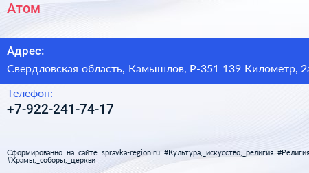 Атом по адресу Свердловская область, Камышлов, Р-351 139 Километр, 2а в дальнейшем Организация, размещена в следующих категориях: