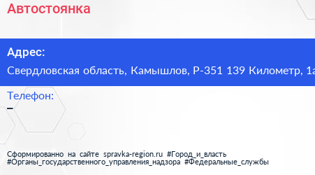 Автостоянка по адресу Свердловская область, Камышлов, Р-351 139 Километр, 1а в дальнейшем Организация, размещена в следующих категориях: