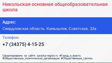 Никольская основная общеобразовательная школа по адресу Свердловская область, Камышлов, Советская, 32а в дальнейшем Организация, размещена в следующих категориях: