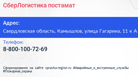 СберЛогистика, постамат по адресу Свердловская область, Камышлов, улица Гагарина, 11 к А в дальнейшем Организация, размещена в следующих категориях: