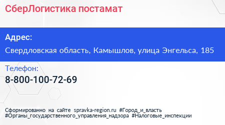 СберЛогистика, постамат по адресу Свердловская область, Камышлов, улица Энгельса, 185 в дальнейшем Организация, размещена в следующих категориях: