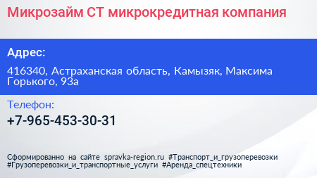 Микрозайм-СТ, микрокредитная компания по адресу 416340, Астраханская область, Камызяк, Максима Горького, 93а в дальнейшем Организация, размещена в следующих категориях: