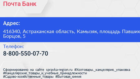 Почта Банк по адресу 416340, Астраханская область, Камызяк, площадь Павших Борцов, 5 в дальнейшем Организация, размещена в следующих категориях: