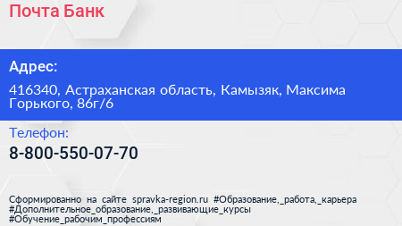 Почта Банк по адресу 416340, Астраханская область, Камызяк, Максима Горького, 86г/6 в дальнейшем Организация, размещена в следующих категориях: