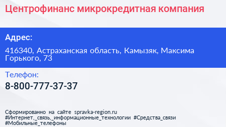Центрофинанс, микрокредитная компания по адресу 416340, Астраханская область, Камызяк, Максима Горького, 73 в дальнейшем Организация, размещена в следующих категориях: