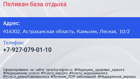 Пеликан, база отдыха по адресу 416302, Астраханская область, Камызяк, Лесная, 10/2 в дальнейшем Организация, размещена в следующих категориях: