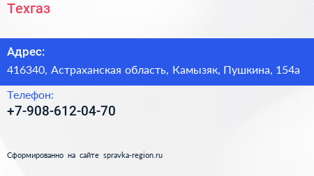 Техгаз по адресу 416340, Астраханская область, Камызяк, Пушкина, 154а в дальнейшем Организация, размещена в следующих категориях: