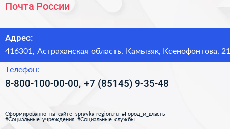Почта России по адресу 416301, Астраханская область, Камызяк, Ксенофонтова, 21 в дальнейшем Организация, размещена в следующих категориях: