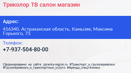 Триколор ТВ, салон-магазин по адресу 416340, Астраханская область, Камызяк, Максима Горького, 73 в дальнейшем Организация, размещена в следующих категориях: