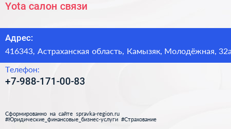 Yota, салон связи по адресу 416343, Астраханская область, Камызяк, Молодёжная, 32а в дальнейшем Организация, размещена в следующих категориях: