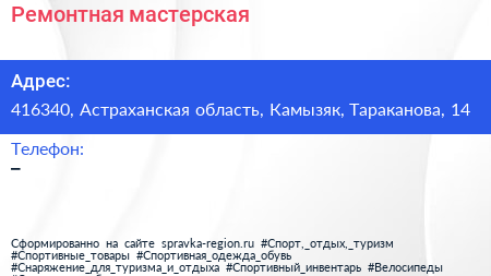 Ремонтная мастерская по адресу 416340, Астраханская область, Камызяк, Тараканова, 14 в дальнейшем Организация, размещена в следующих категориях: