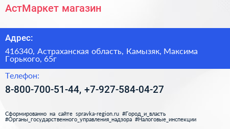 АстМаркет, магазин по адресу 416340, Астраханская область, Камызяк, Максима Горького, 65г в дальнейшем Организация, размещена в следующих категориях: