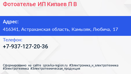Фотоателье, ИП Кипаев П.В. по адресу 416341, Астраханская область, Камызяк, Любича, 17 в дальнейшем Организация, размещена в следующих категориях: