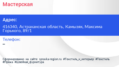Мастерская по адресу 416340, Астраханская область, Камызяк, Максима Горького, 89/1 в дальнейшем Организация, размещена в следующих категориях: