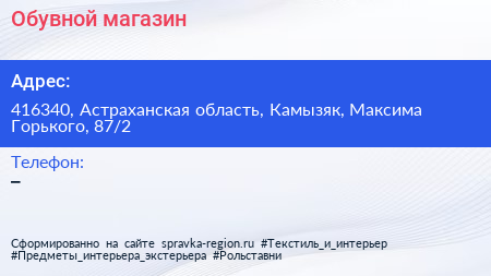 Обувной магазин по адресу 416340, Астраханская область, Камызяк, Максима Горького, 87/2 в дальнейшем Организация, размещена в следующих категориях: