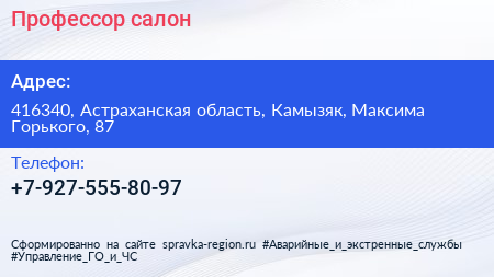 Профессор, салон по адресу 416340, Астраханская область, Камызяк, Максима Горького, 87 в дальнейшем Организация, размещена в следующих категориях: