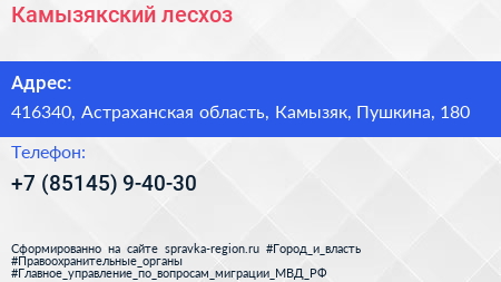 Камызякский лесхоз по адресу 416340, Астраханская область, Камызяк, Пушкина, 180 в дальнейшем Организация, размещена в следующих категориях: